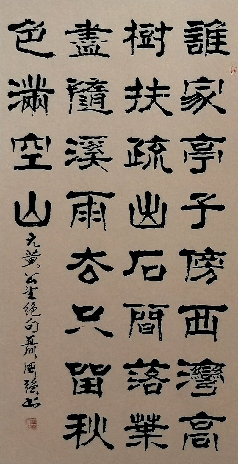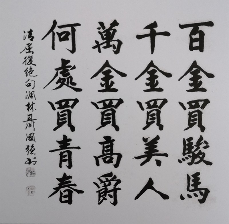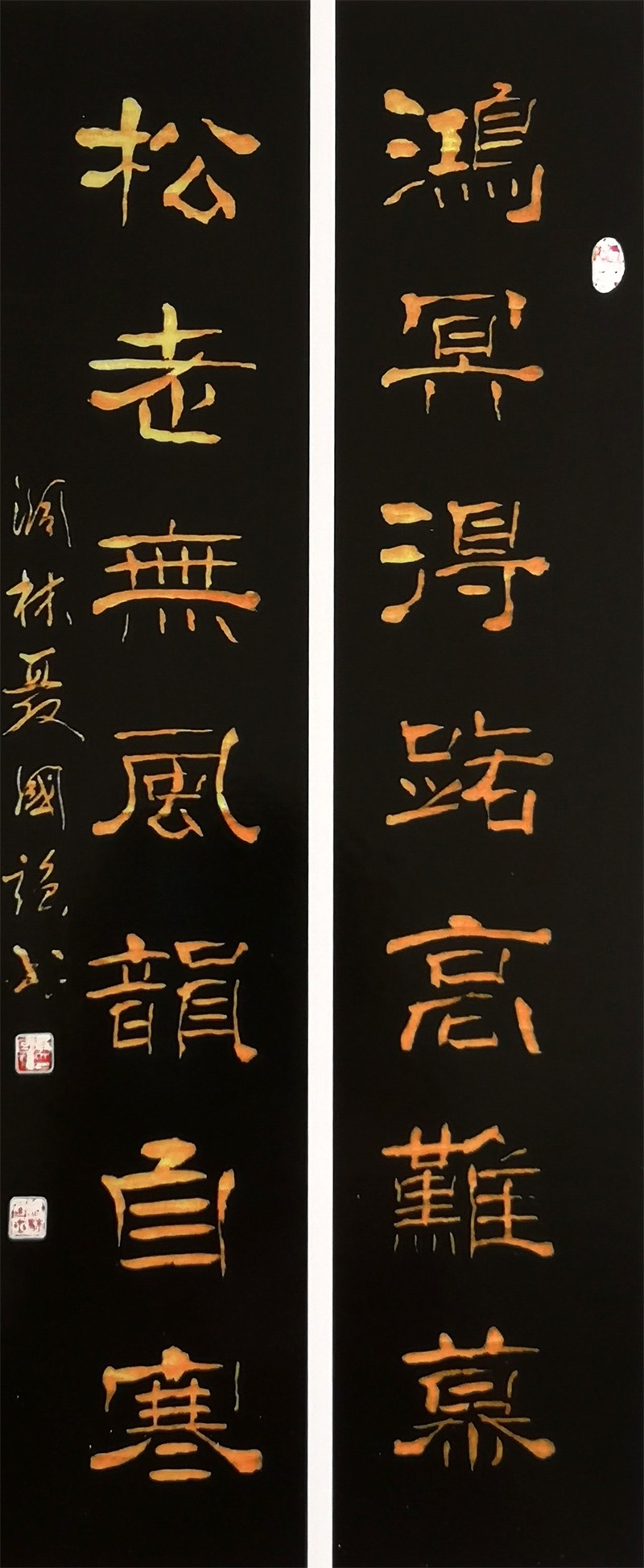 艺术简介 聂国强,字毅甫,号洞林居士,一九四一年九月生,河南荥阳人。毕业于中国书画函授大学研究班,受教于欧阳中石等。善楷、行、隶书,尤精小楷。书法师古不泥古,敢于打破常规,完全依凭个人审美标准广采博取。书作传统功力深厚,清健挺秀,格调朴雅,法度严谨,所书榜书把欧字结体与柳字用笔巧妙地糅和在一起,极富意趣。2000年获“世界华人艺术家”称号。2006年《中国收藏》曾以“独具一格的书法艺术”为题进行了推介。作品在全国和国际展览中多次获奖,并入刻多处世界级和包括奥运纪念碑林在内的国家级碑林。